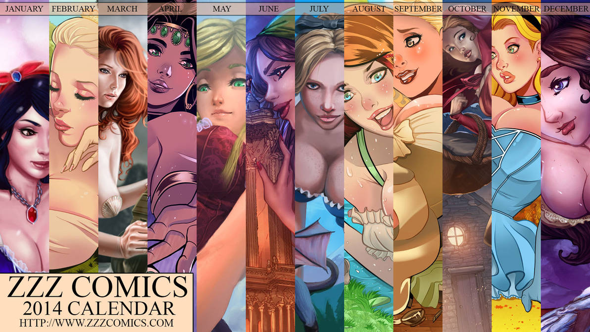 Our classic calendar from 2014! A different fairy tale giantess every month on your desktop! ZZZ Comics 2014 GTS Desktop Calendar brings fairy tales to giantess size! Several incredibly talented artists created a beautiful and sexy giantess image for each month.