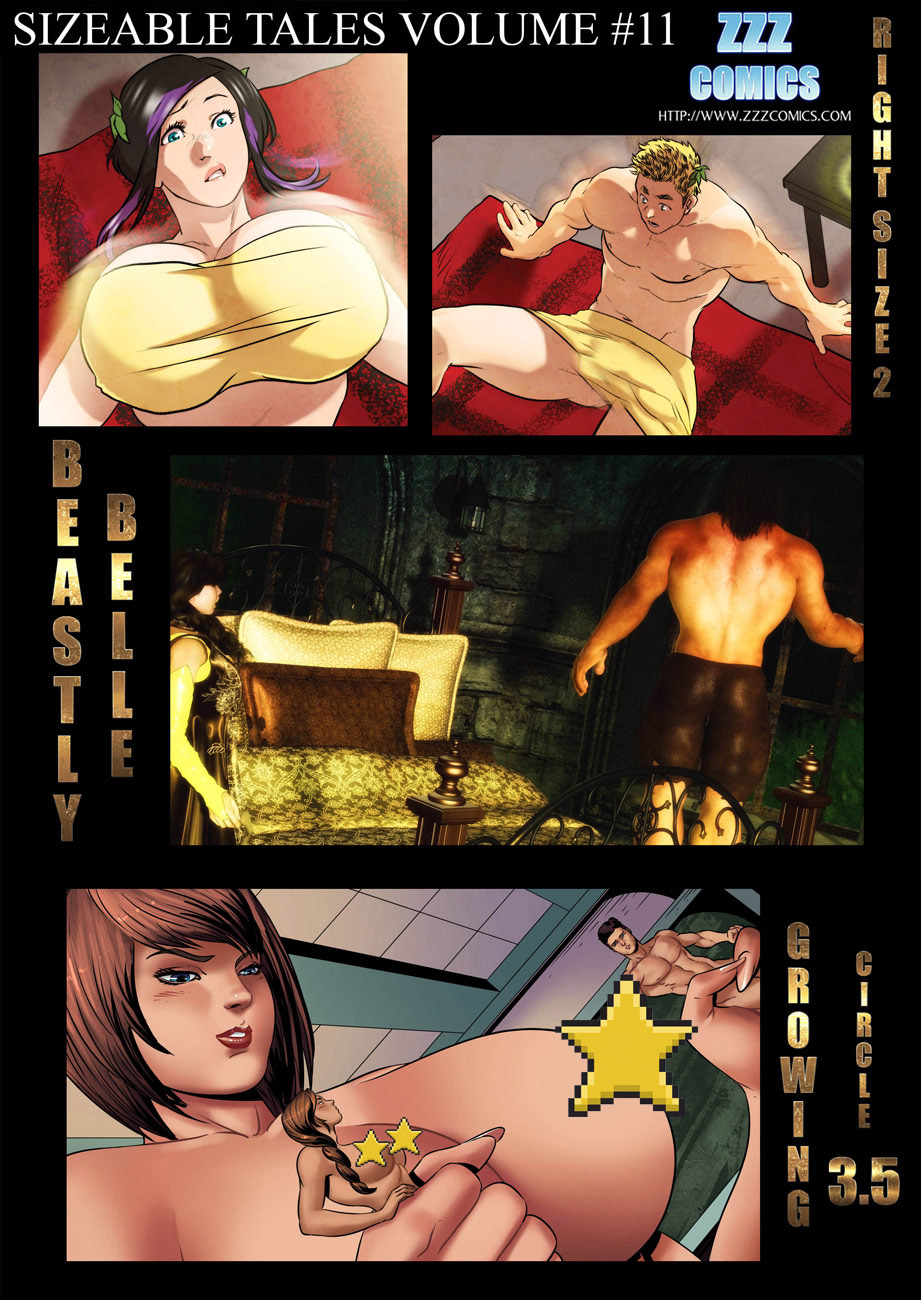 The 11th chapter of 3 size changing stories in one comic! Right Size for Cosplay 2 continues with more male and female costume outgrowing, Growing Circle 3.5 sets up Growing Circle 4 and includes clothes busting giantess growing as well as women shrinking out of clothes via size transfer, and Beastly Belle includes an FMG twist on a classic story in a 3D comic and more!
