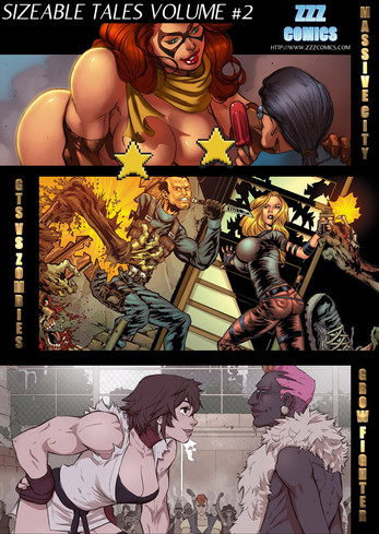 The second volume collecting three sexy size changing tales in one comic! Massive City is set in a city of high libido size changing super heroes and super villains! See the shrinking super hero Contracta face the growing when he is aroused El Toro! Instead of fighting they end up going at it in naughty time and size change! FMG in this one too! GTS VS Zombies is set in a post apocalyptic future where the zombie cure has a a couple positive side effects - super durable skin, super strength and the ability to grow to gigantic size - and so far only one person has been able to use the cure! Will Stacey's new growing ability help keep her friends safe from the Zombies? Not when they wander off to get busy in the worst possible place! Grow Fighter is a fighting game spoof where winning the Grow Fighter tournaments mean more height, power and muscle growth. Sexy Gemma is about to go against Dorin, the winner gets to add the other fighters growth augmentation device to their own! But Dorin is much bigger than Gemma, how will she win against him? And if she does win, how will she use her new increased size in bed with her boyfriend Jude? Massive City contains shrinking woman, clothes ripping, shrinking out of clothes, FMG, amazon, super heroes, mini giantess, giantess, male muscle, height and penis growth, shrunken woman sexual activity, shrunken woman growing to muscle giantess, giantess insertion of giant man. GTS VS Zombies includes Giantess, clothes ripping, breast growth, ass growth, peril, spanking, zombie killing blood and action, giantess crushing zombies and giantess growing through ceiling. Grow Fighter contains mini giantess, FMG, clothes ripping, breast growth, male muscle and height growth, spanking, fighting and role reversal.
